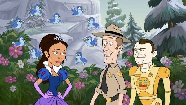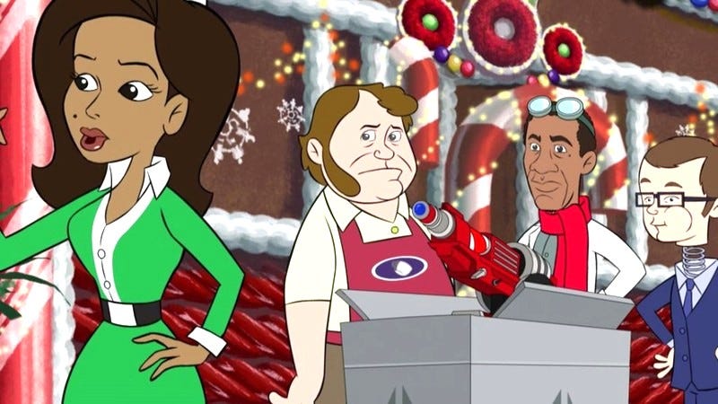 Everything (except the Eureka technology) works in this episode. The peril is high, the laughs are frequent, and the satire is biting. The animation is spot on, the visual effects dazzle and the audio effects are pitch perfect. Putting a bow on the Christmas gift, Jim Parsons (Sheldon on The Big Bang Theory) is just the right guest star to play the voice of Carl, Sheriff Carter’s jeep.