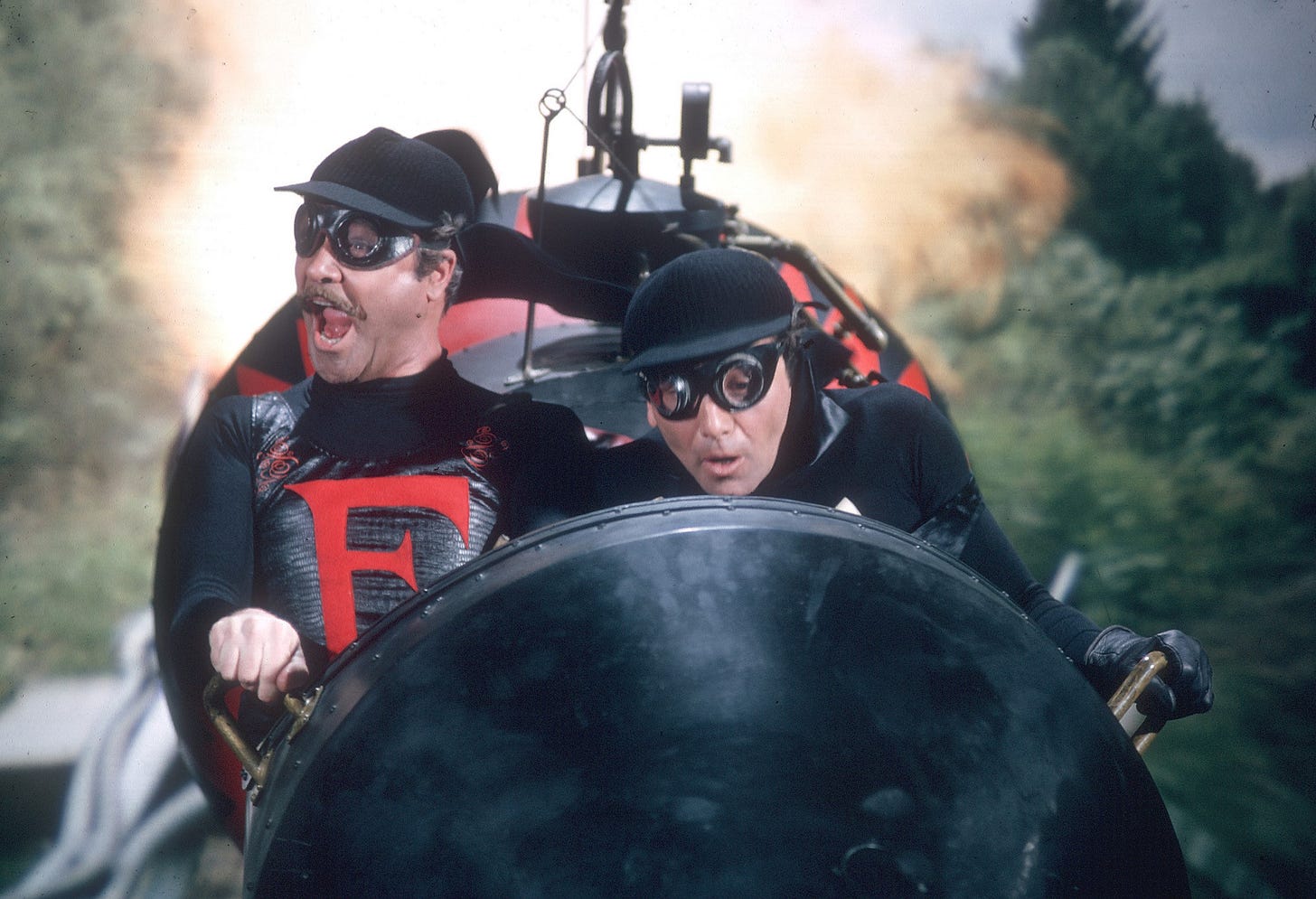 Jack Lemmon and Tony Curtis play daredevil rivals who are the leading racers in the competition. Lemmon, as Professor Fate, is a villain of the Wile E. Coyote mode—his devious plans usually backfire spectacularly, yet he inexplicably survives the consequences.